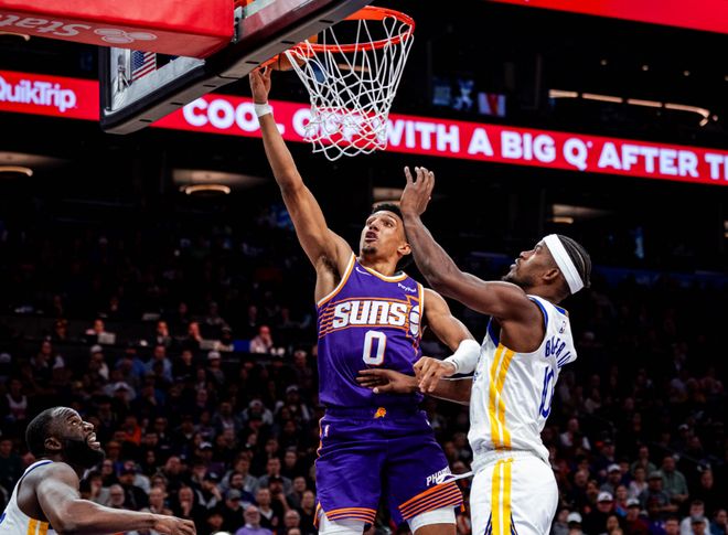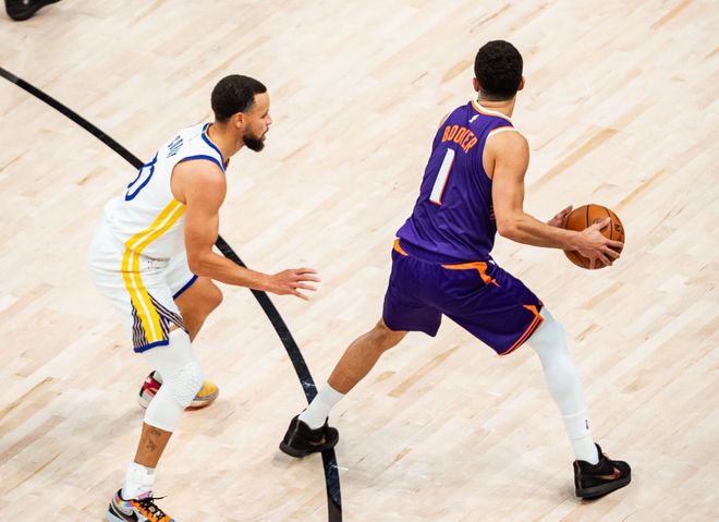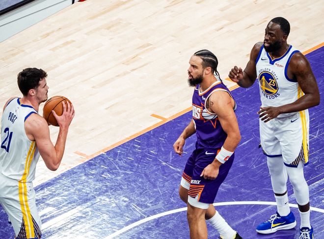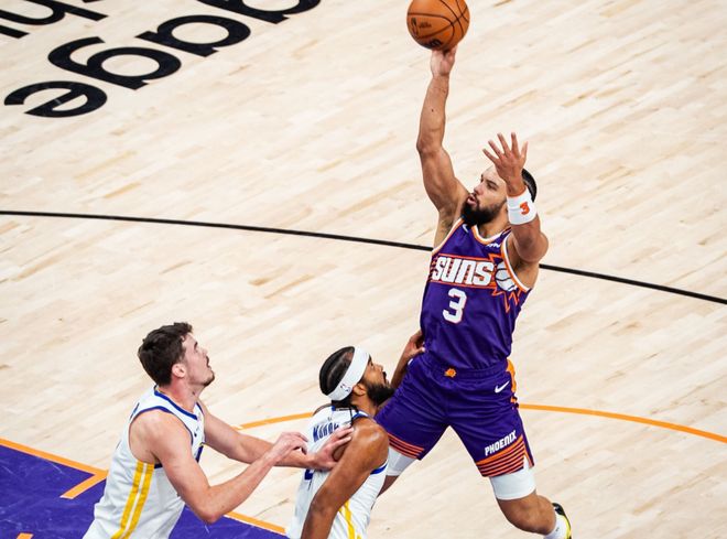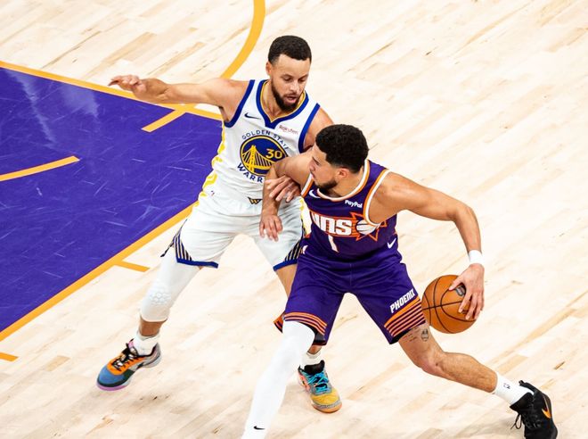 节末穆迪命中三分,半场勇士53-46领先太阳。进入下半场,巴特勒继续突破上反篮+吃饼扣篮,库里也造三分犯规,勇士最多拉开14分分差。布克单打库里,奥尼尔和布鲁克斯追分,布克续上三分球。勇士丢了太多后场篮板,进攻下滑很快,库里也找不到手感。后半段布克三分球追平,波杰跳投稍稍止血,库里终于续上三分!但此后勇士彻底哑火,三节结束时,勇士71-69领先太阳。决战第四节,吉莱斯皮连续得分反超勇士,波杰连拿5分稳定一下节奏,但库明加上篮被帽,双方再度陷入拉锯战。